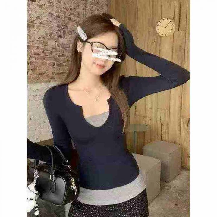 6180件美式甜辣妹韩版假两件长袖t恤女春夏修身打底衫撞色纯欲显瘦上衣,独立包装,码数M-2XL,分货➕0.5,货号001#30