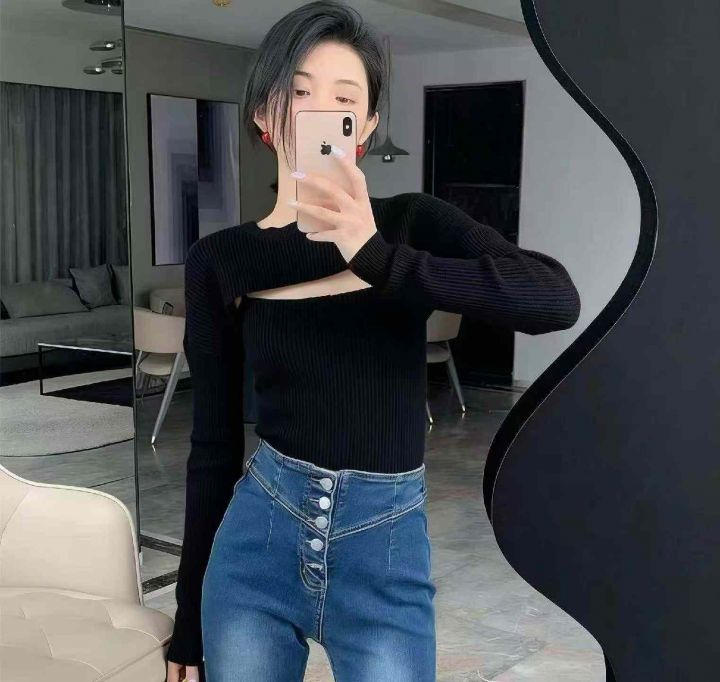 春季新款辣妹性感设计款针织毛衣2件套,独立包装,均...