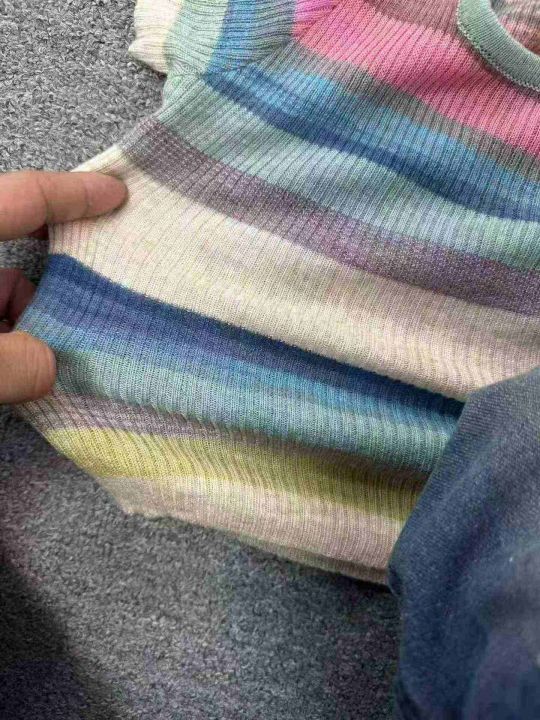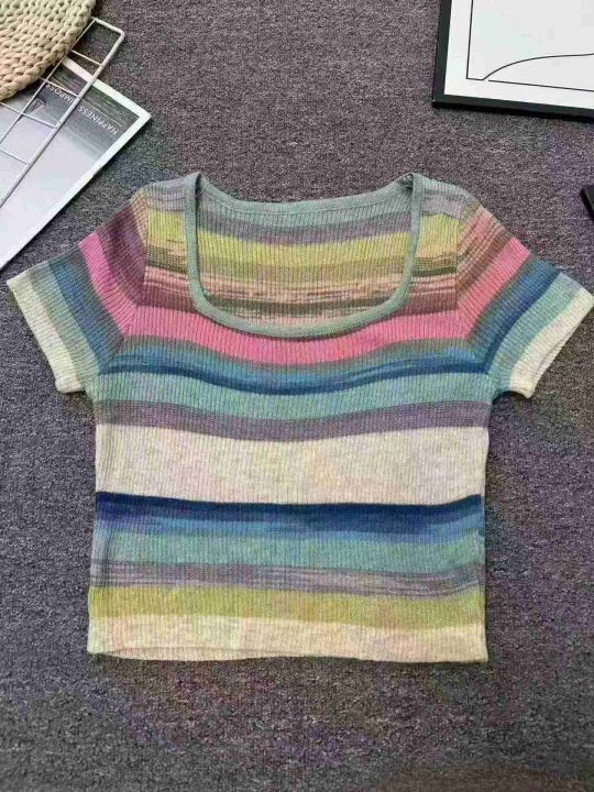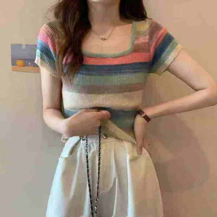 ☕️彩虹条纹方领短袖t恤女冰丝针织短款上衣超好看辣...