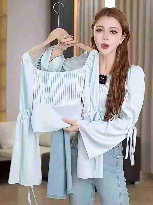 ☕️夏季蓝色衬衫长袖方领法式气质雪纺小衫宽松短款洋气独特别致上衣122件...