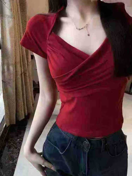 ☕️法式复古交叉v领酒红色短袖T恤女夏季辣妹设计感收腰修身短款上衣230件...