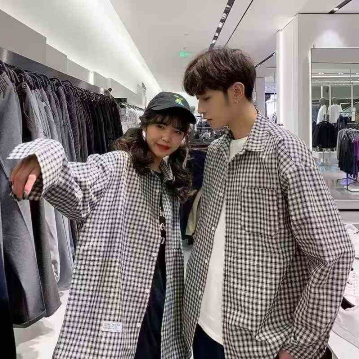 新款长袖衬衫男女时尚潮流百搭撞色格子衬衫上衣服男外...
