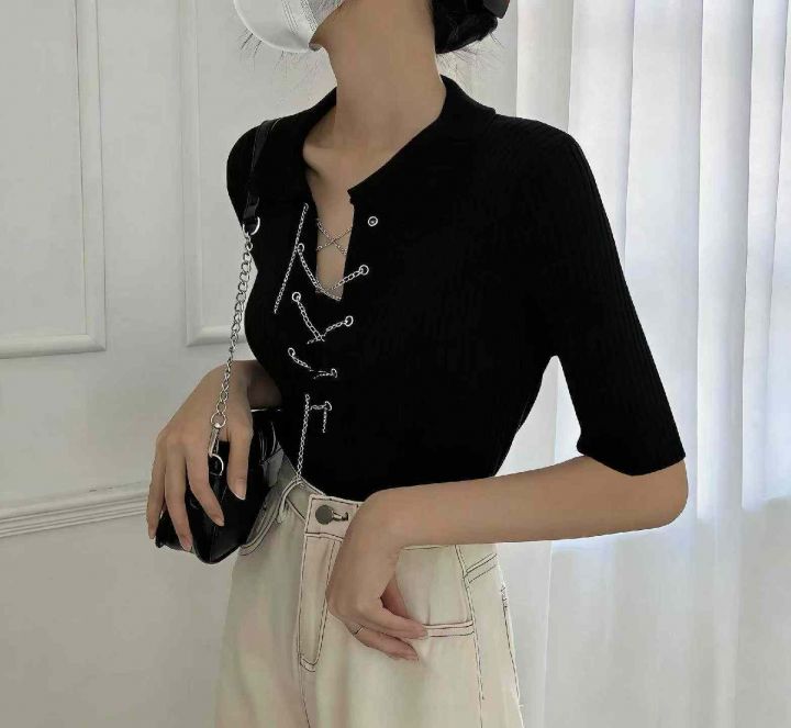 夏季新款网红设计款链条弹力修身显瘦针织短袖Polo衫,独立包装,均码面料柔...