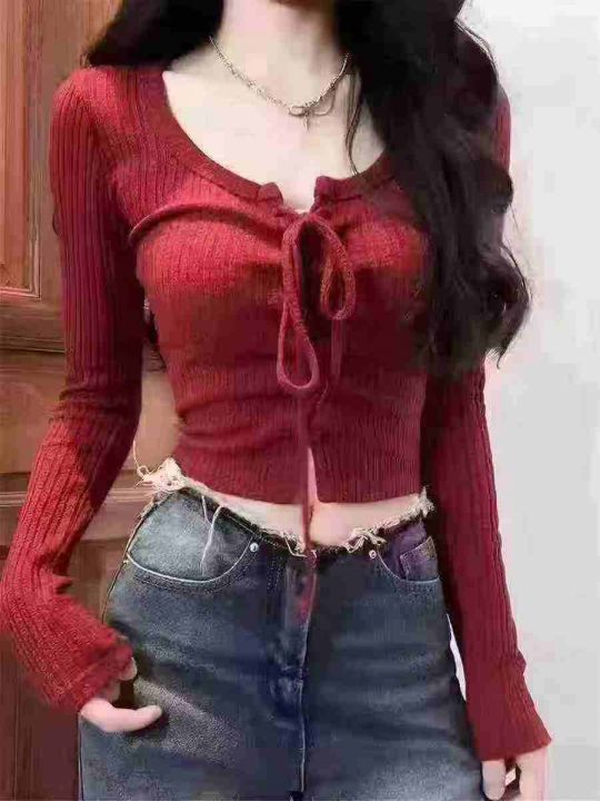 880件春装新款性感辣妹短款抽绳T恤长袖小众款高腰露脐...