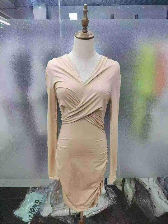 [月亮]:性感交叉扭结深V辣妹包臀长袖连衣裙