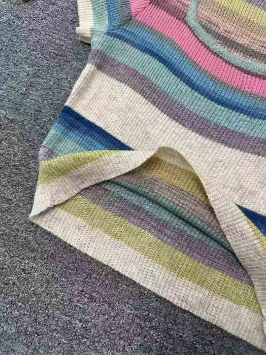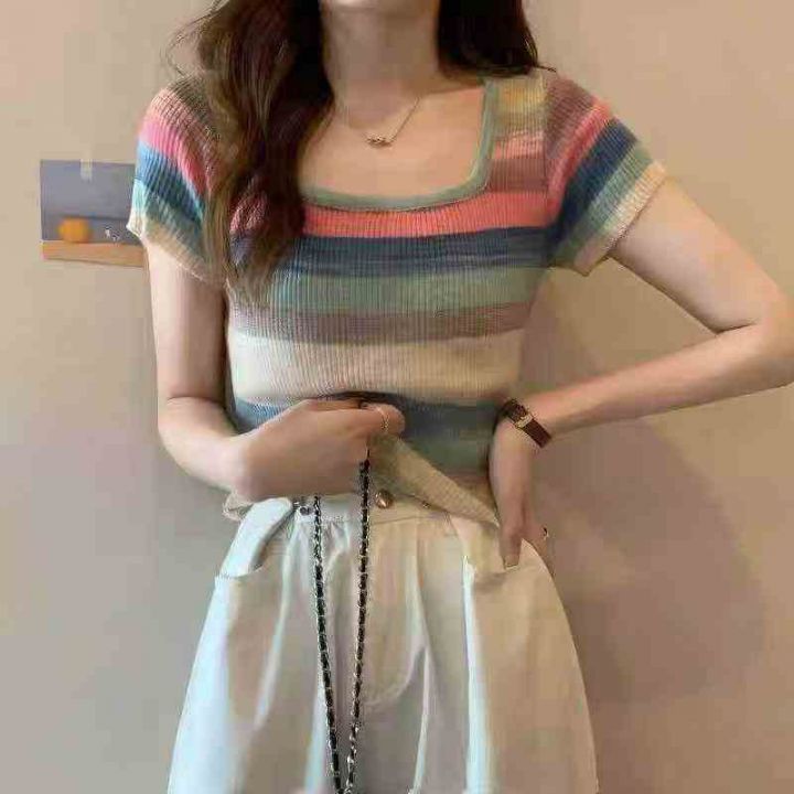 ☕️彩虹条纹方领短袖t恤女冰丝针织短款上衣超好看辣...