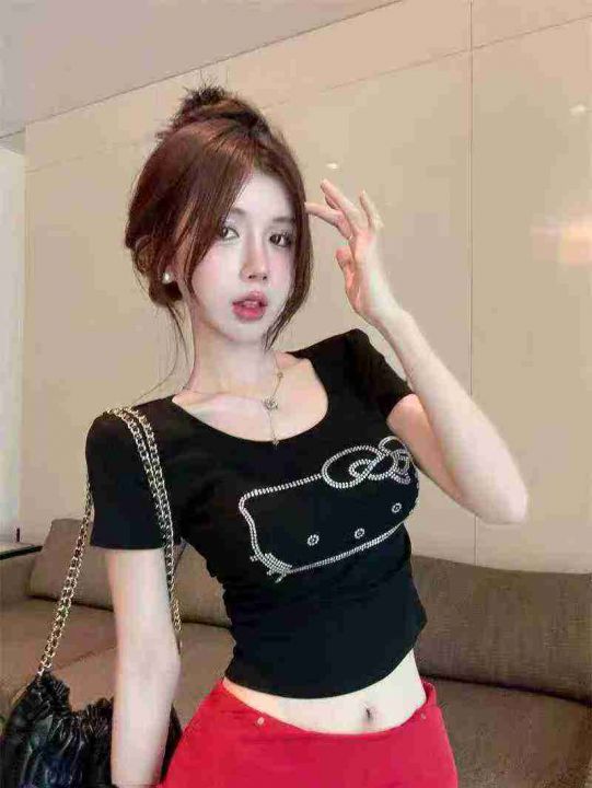 [月亮]:猫咪烫钻洋气短款气质辣妹棉T恤