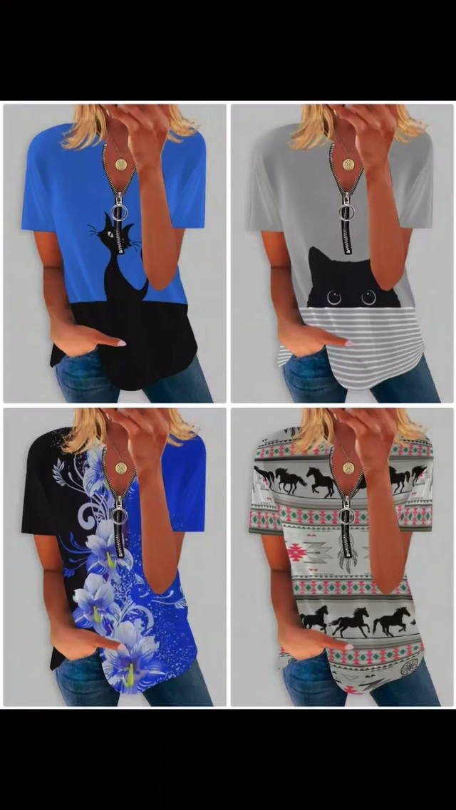 全清价3.882026夏季欧美热销wish 独立站女民族风印花棉短袖v领拉链T恤上衣...