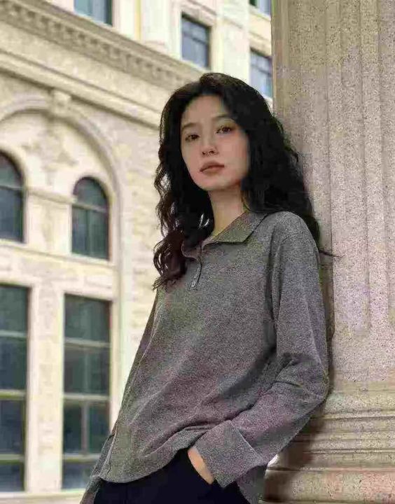 春秋新款洋气减龄百搭翻领POLO上衣简约设计感纯色长袖...