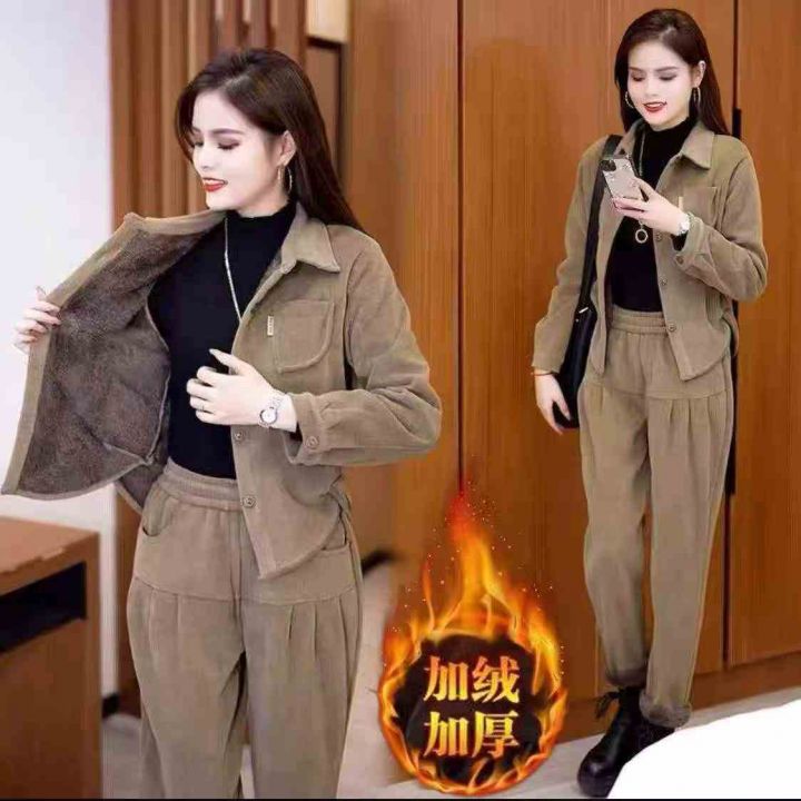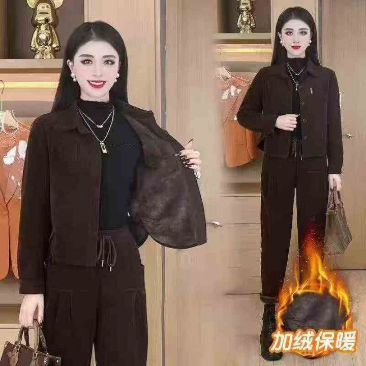 冬季加绒加厚时尚套装女新款女士减龄灯芯绒外套妈妈装...