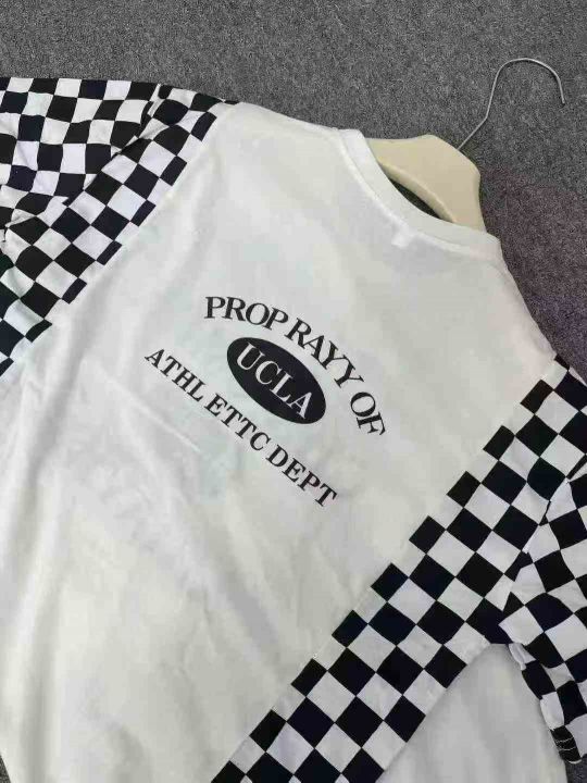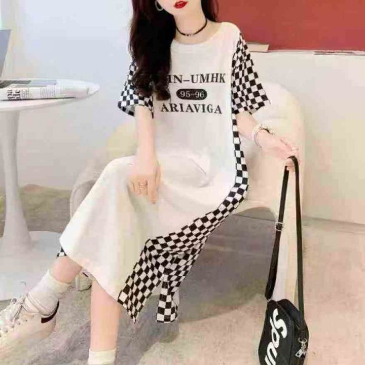 ☕️纯棉大码拼接格子长款过膝短袖T恤夏季韩版慵懒风...