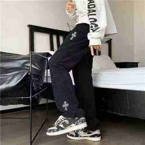 欧美高街vibe风简约刺绣男士灯芯绒阔腿拖地卫裤.单款两个色150条M-2XL独立...