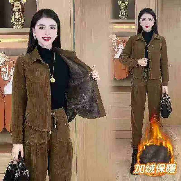 冬季加绒加厚时尚套装女新款女士减龄灯芯绒外套妈妈装高档两件套码数:2-4...