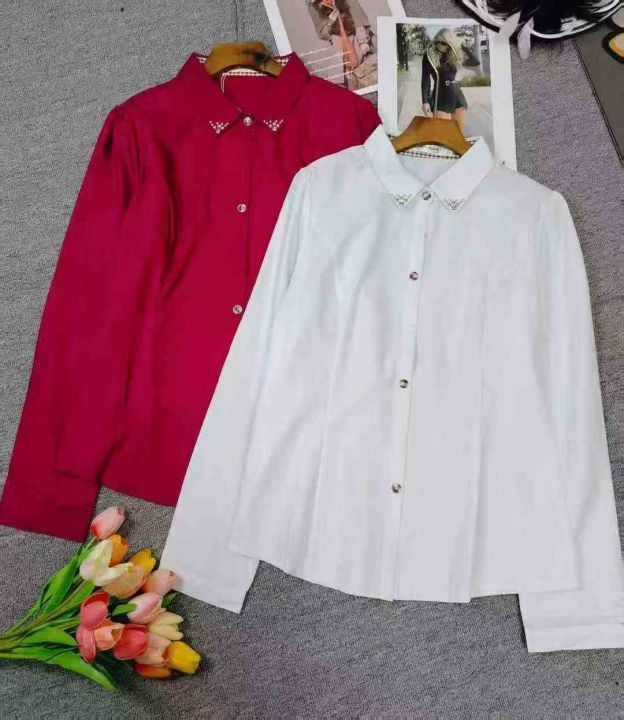 这款烫钻领职业衬衫,850件,通勤/工装都能穿,酒红/...