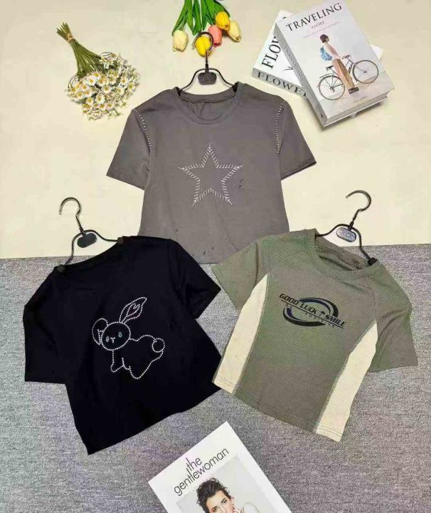 时尚洋气修身显瘦短款辣妹印花短袖T恤,图片款,品质好,工厂原单,5件一包