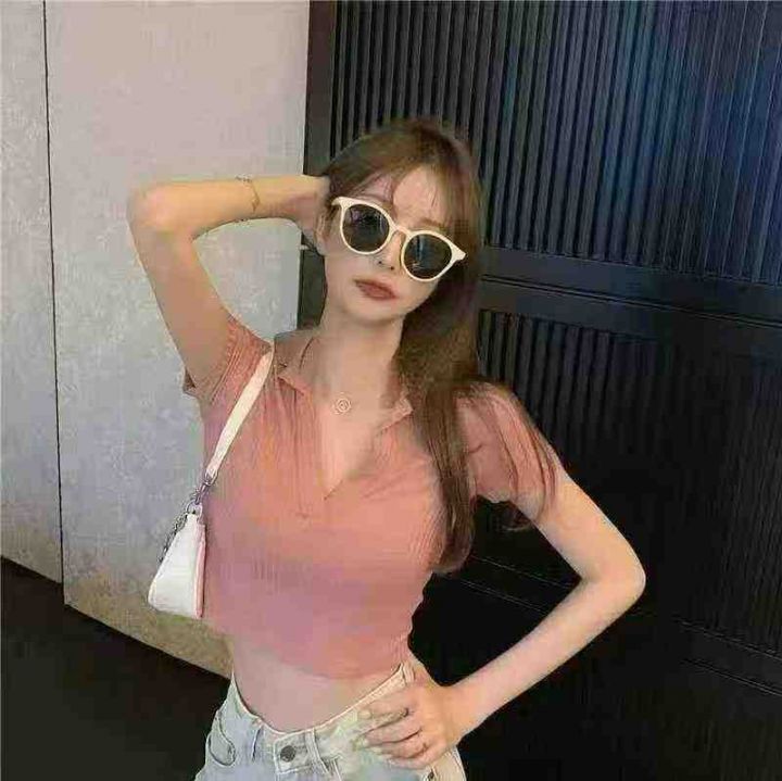2000件小整杂 时尚辣妹风Polo领大V短袖T恤女夏修身百搭高腰露脐短款上衣打...