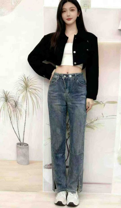 全清11.8开叉牛仔裤女高腰2025春秋新款修身显瘦高弹力...