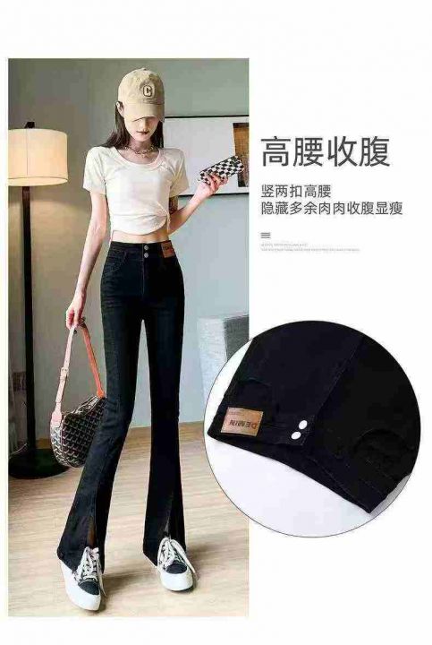 开叉高腰显瘦黑色马蹄微喇叭牛仔裤,单款单色,独立包装,数量1000条,25-3...