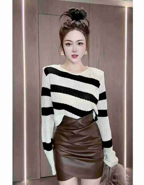 春季新款御姐轻熟风韩系高级感撞色条纹长袖针织衫,独...