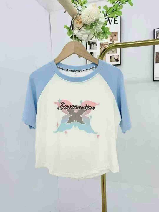 清5.8分货➕1甜酷蝴蝶拼色插肩短袖t恤女,带弹力,数...