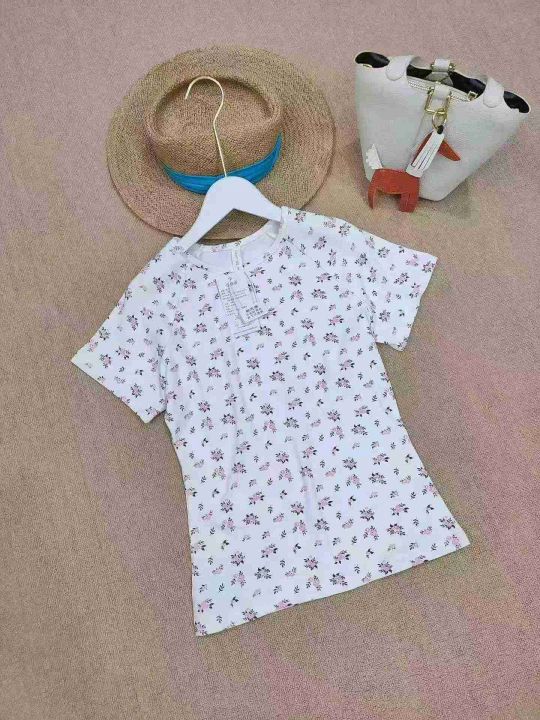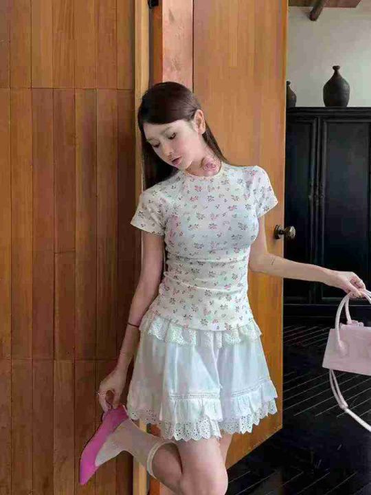 [月亮]:甜美碎花修身高弹圆领正肩辣妹棉T恤