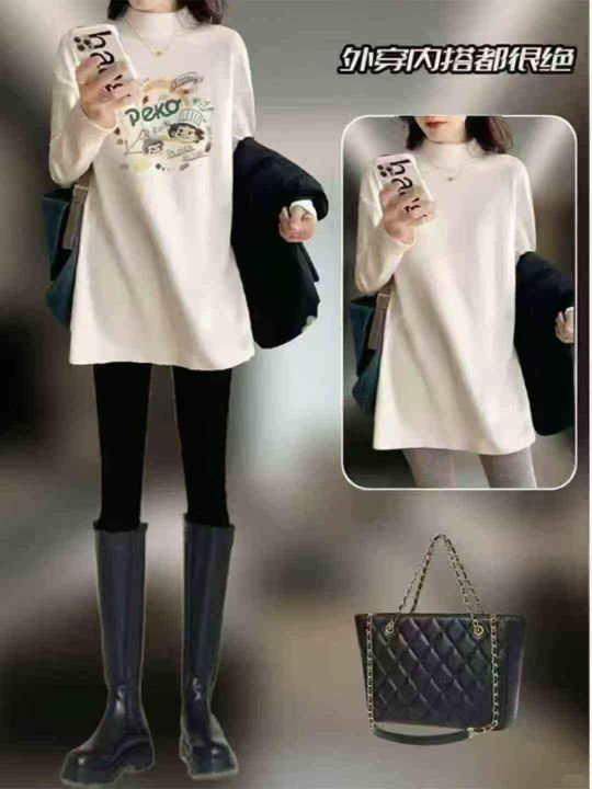 圆领/半高领德绒打底衫女新款内搭宽松白色印花中长款...