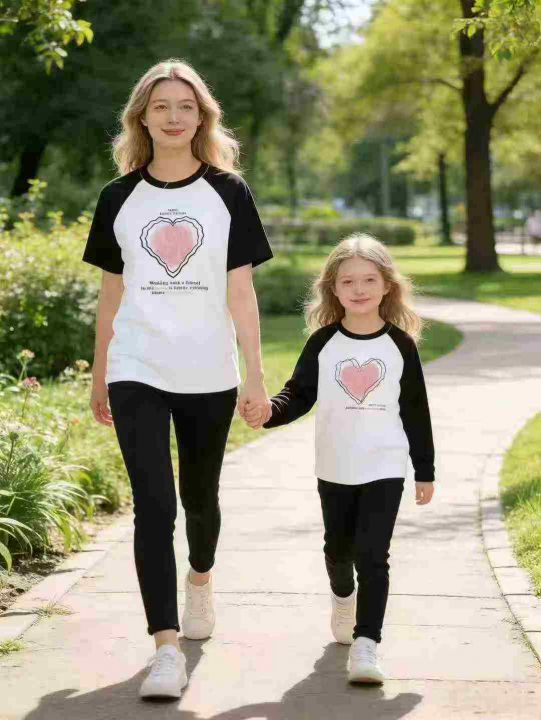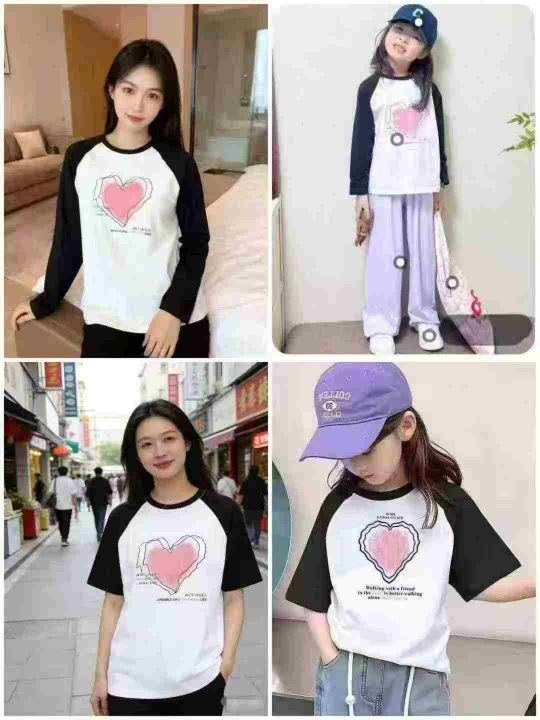 3800件左右带心型logo插肩亲子装体恤,尺码 童装110--160 成人S-M-L,后领包边 可分长短袖出货,独立包装带吊牌