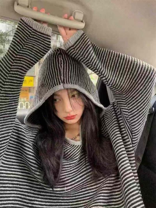 全清8.8休闲百搭慵懒风连帽针织衫毛衣秋冬新款复古宽松大码条纹长袖上衣,...