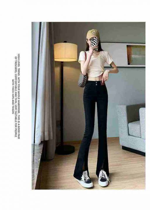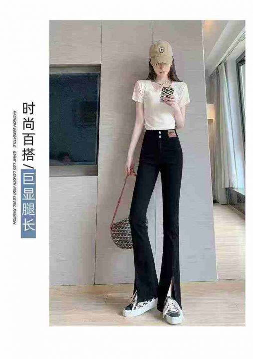 开叉高腰显瘦黑色马蹄微喇叭牛仔裤,单款单色,独立包...