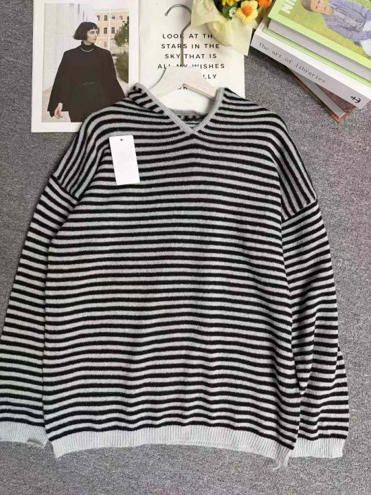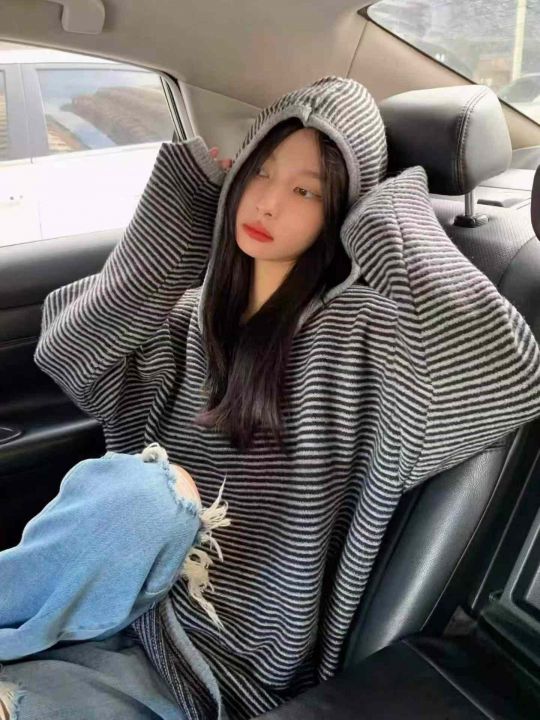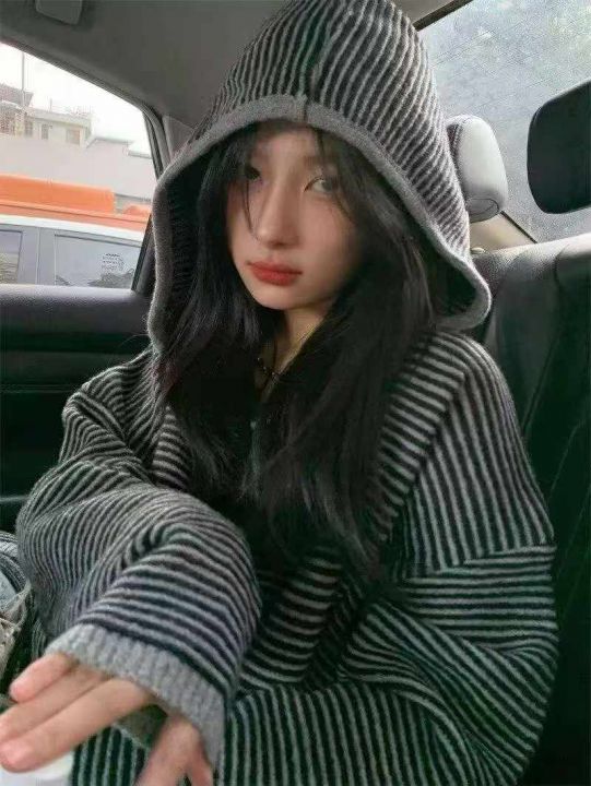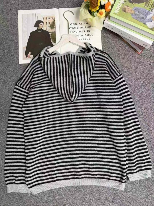休闲百搭慵懒风连帽针织衫毛衣秋冬新款复古宽松大码条纹长袖上衣,独立包装带吊牌,312件,尺码S-2XL