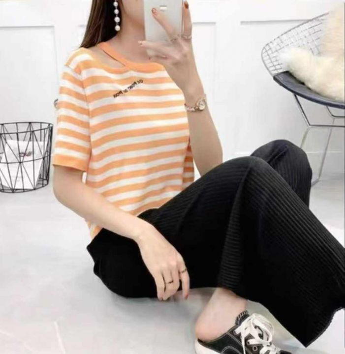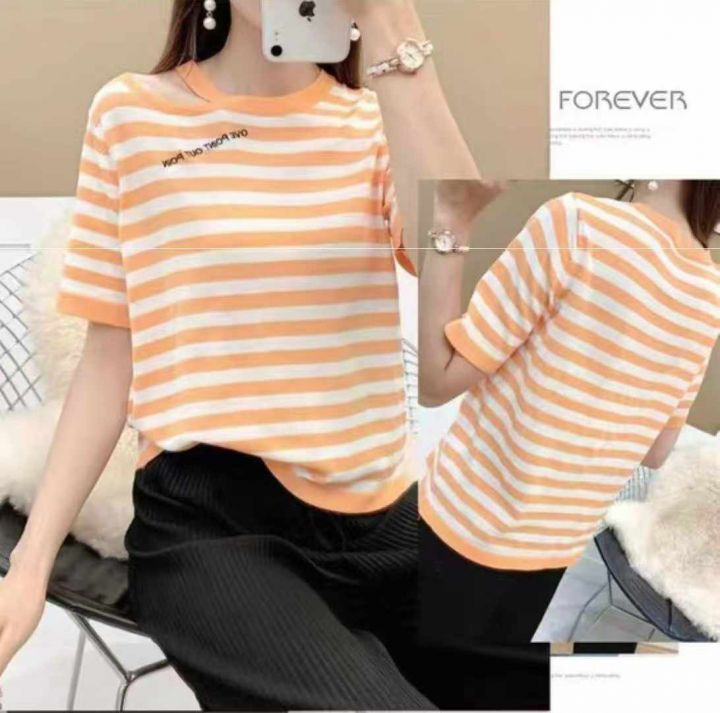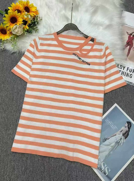 夏季新款宽松百搭撞色条纹刺绣设计款针织短袖T桖,独...