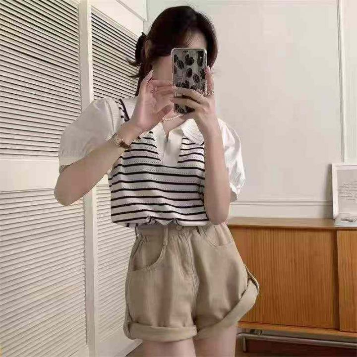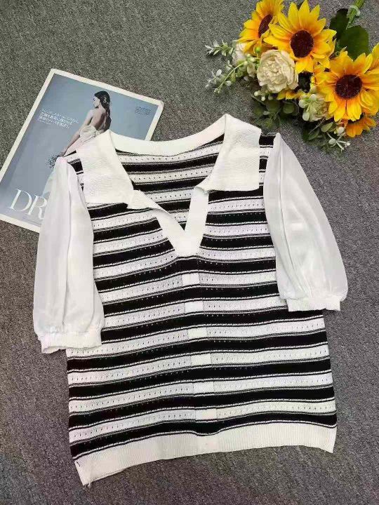 夏季新款冰丝条纹Polo领假两件雪纺拼接袖针织短袖T桖...