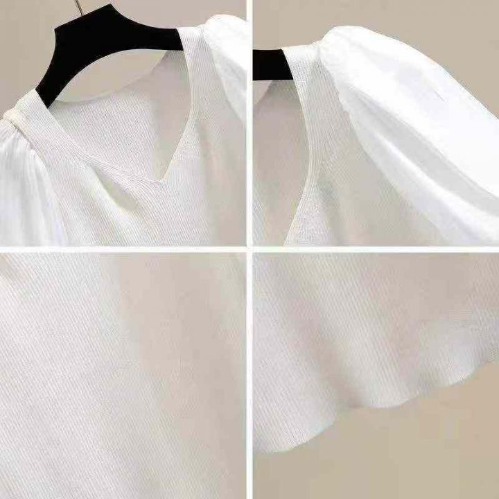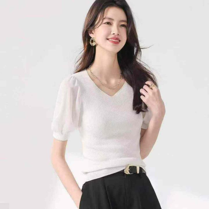 夏季新款法式复古v领雪纺拼接泡泡袖冰丝短袖针织小衫...