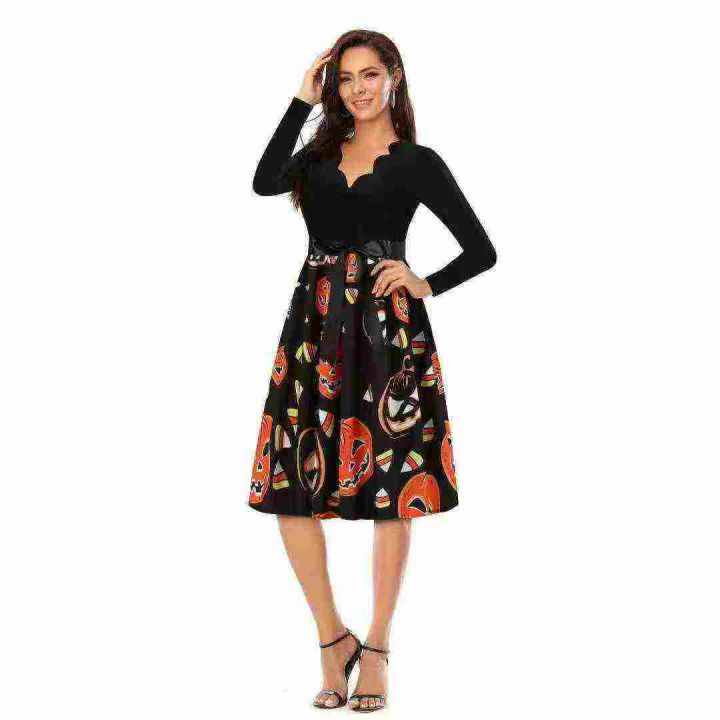腾仓库,亏本清仓840件性感V领长袖黑色拼接印花大摆裙。花型多,面料舒适,...