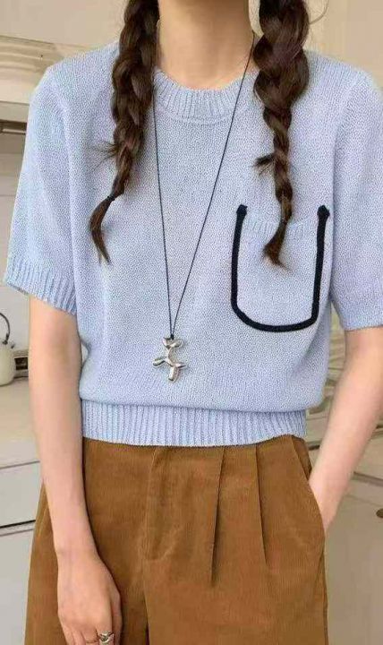夏季新款韩系亚麻透气肌理薄款圆领口袋设计款冰丝针织...