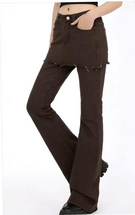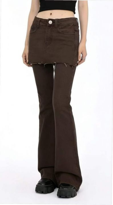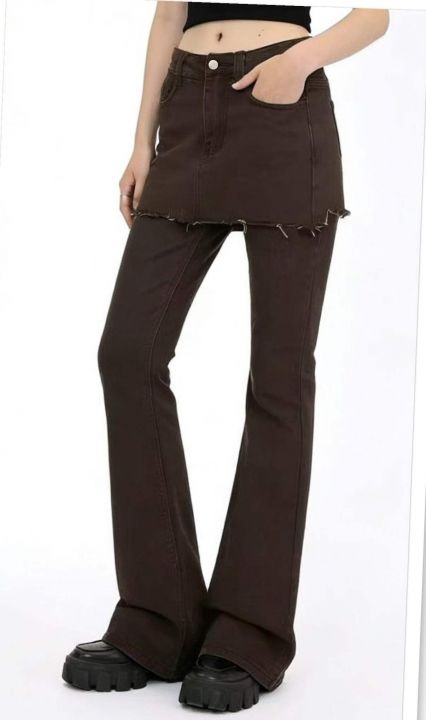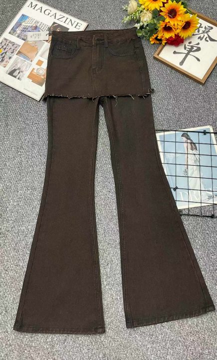春季新款网红爆款复古做旧设计感假两件牛仔微喇裤,独...