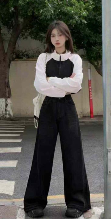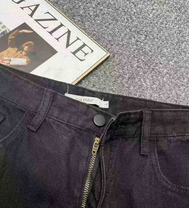 春季新款网红复古洗水棉黑色直筒阔腿牛仔裤,独立包装...