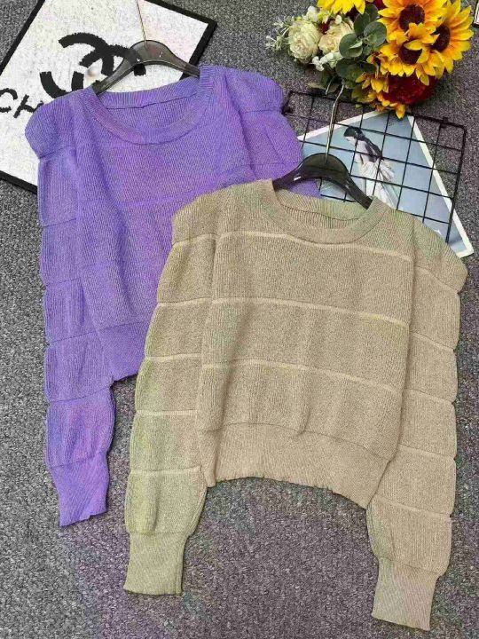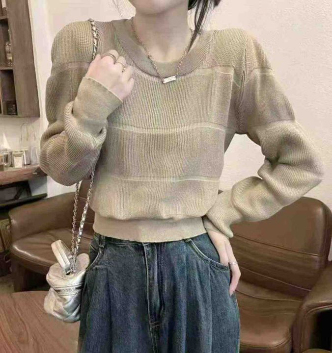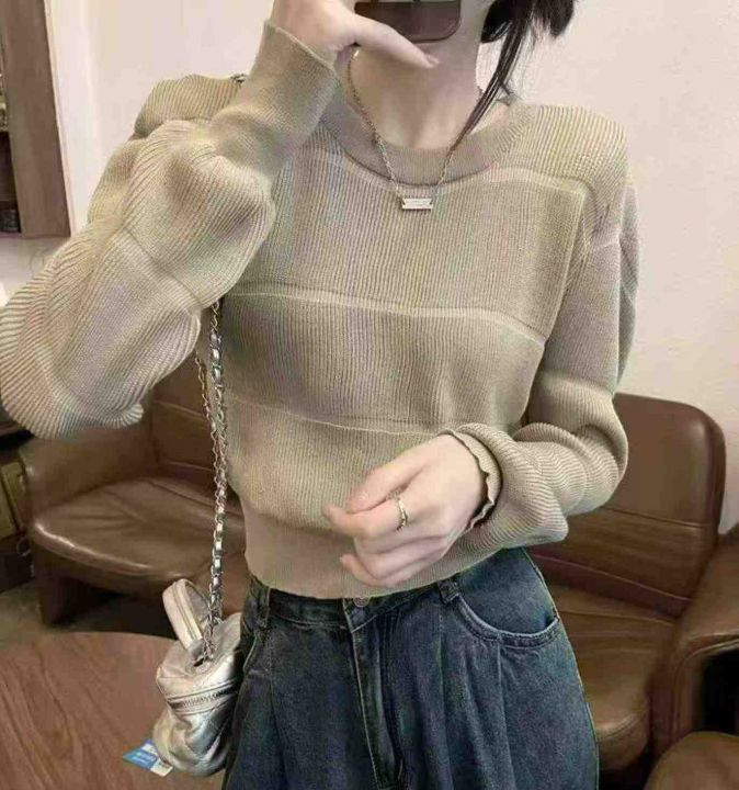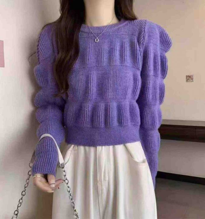 春季新款时尚洋气别致正肩高腰短款泡泡袖圆领软糯毛衣...