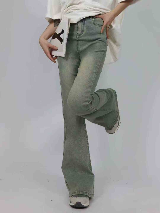 水洗黄泥染微喇叭牛仔裤女秋冬新款高腰显瘦辣妹40件,...