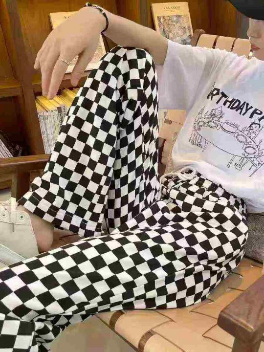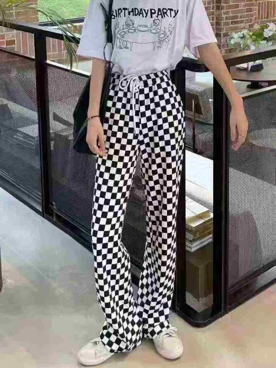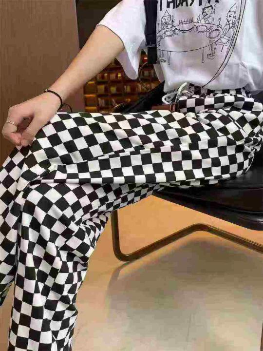 113条棋盘格休闲运动女裤新款宽松卫裤黑白格子直筒阔...