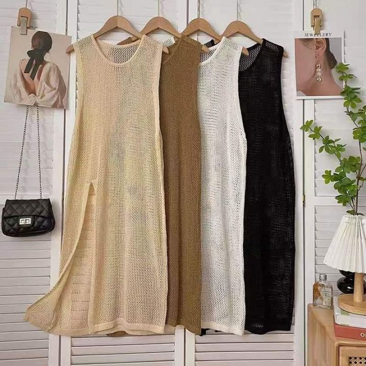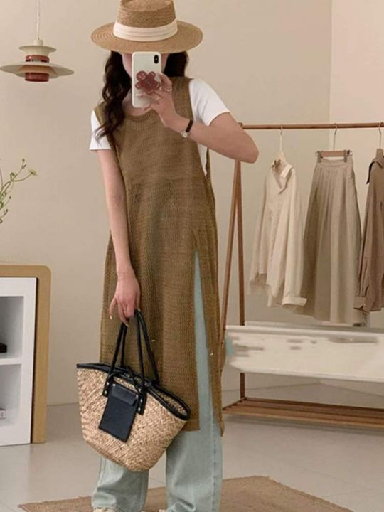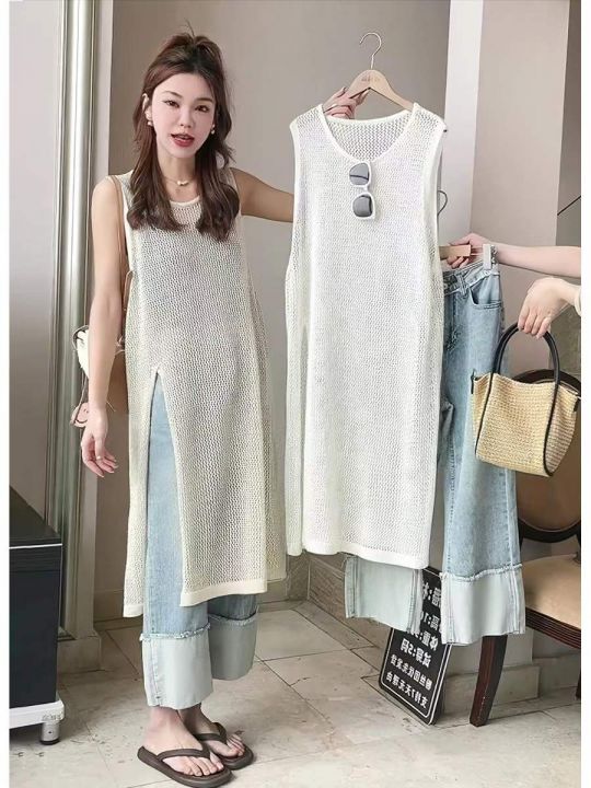 夏季新款网红爆款设计款钩花无袖镂空长款开叉背心针织...