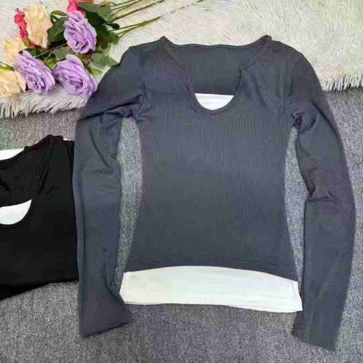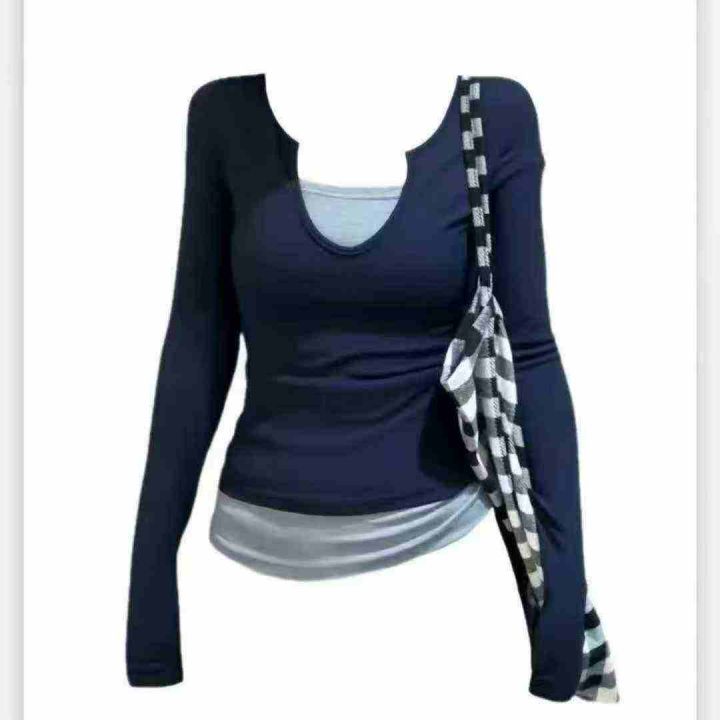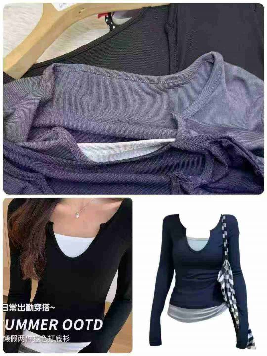 6180件美式甜辣妹韩版假两件长袖t恤女春夏修身打底衫撞色纯欲显瘦上衣,独立包装,码数M-2XL,分货➕0.5,货号001#30
