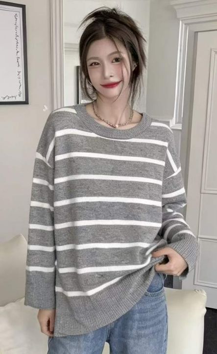 春季新款品牌原单撞色条纹宽松落肩圆领套头毛衣,独立...