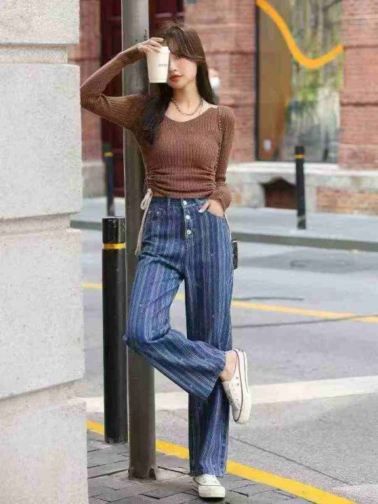 欧美风ins条纹牛仔裤女高腰显瘦阔腿设计感宽松直筒拖地裤,独立包装,S -x...
