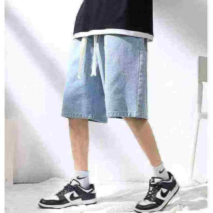 夏季新款男士宽松净版百搭网红复古浅蓝色松紧腰牛仔短裤,独立包装带吊牌,...