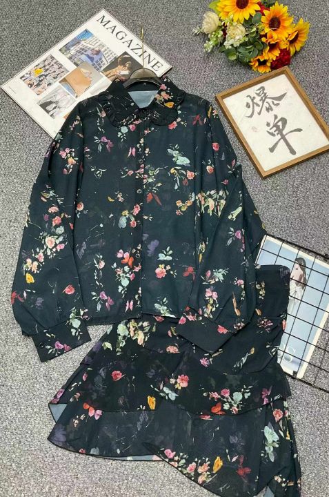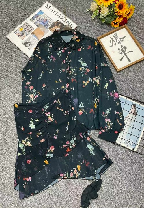 捡漏款,春夏季新款高品质辣妹性感蝴蝶印花雪纺长袖衬衫+气质减龄设计感雪纺半身裙两件套,独立包装,码数S-L码,70套,全清8.8元超低价秒杀!