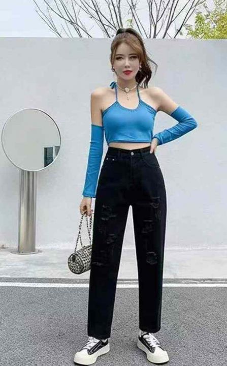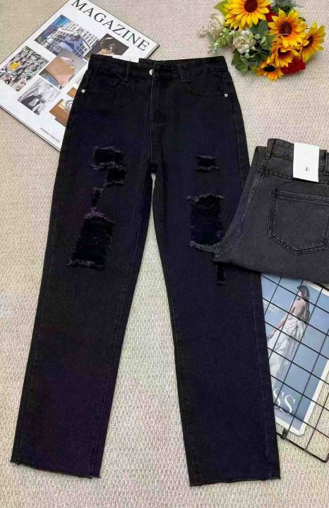 春夏季新款洗水棉网红复古破洞设计款牛仔老爹哈伦裤,...