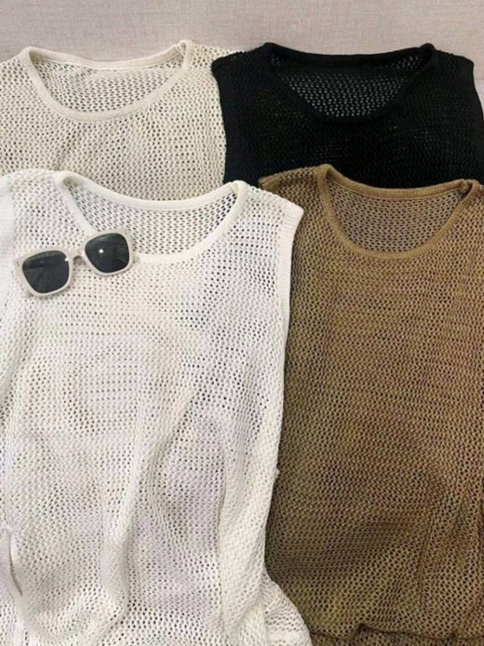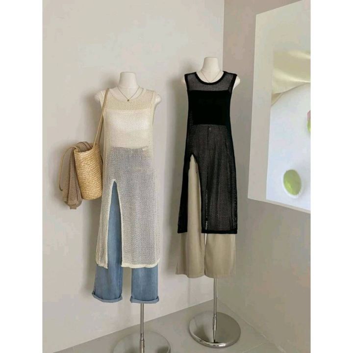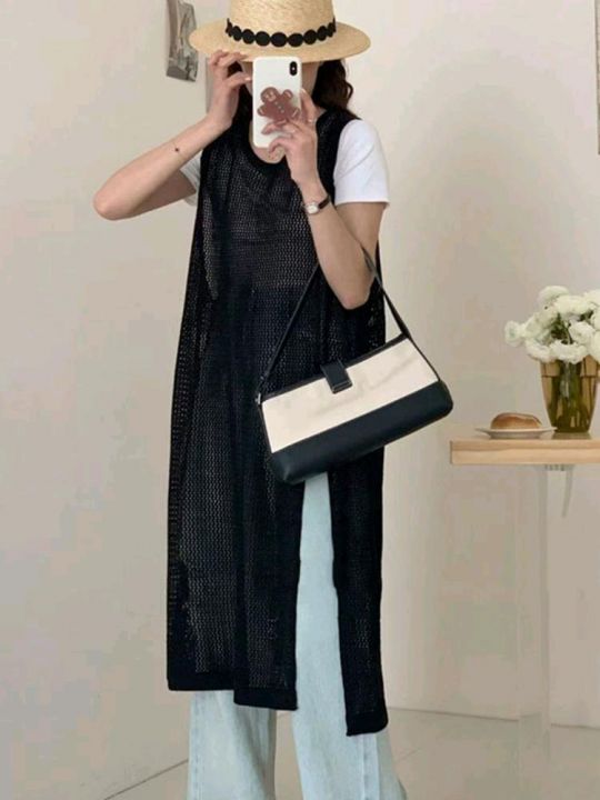 夏季新款网红爆款设计款钩花无袖镂空长款开叉背心针织...
