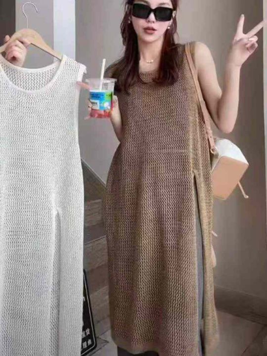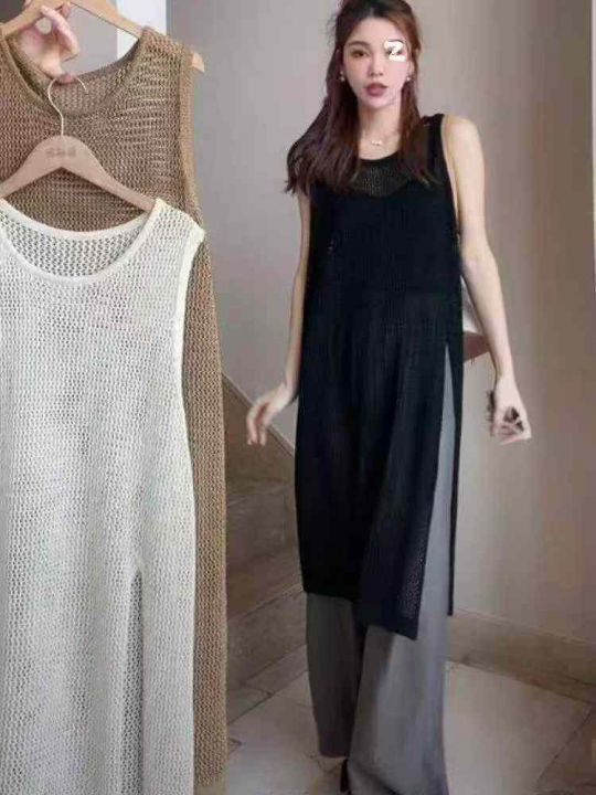 夏季新款网红爆款设计款钩花无袖镂空长款开叉背心针织...