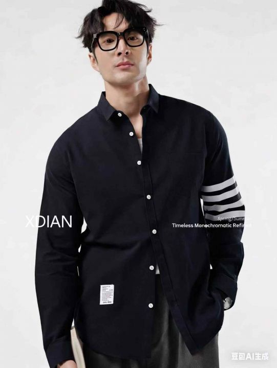 全清8.5潮牌春秋季新款四条纹宽松衬衫男女情侣衬衫长...
